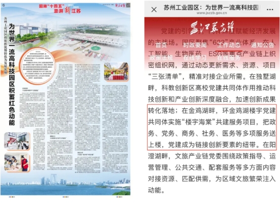 日前,《新華日報》整版關注園區組織部2025年年度工作,省委組織部官網同步刊載《蘇州工業園區:為世界一流高科技園區積蓄紅色動能》全文。文中關注環金雞湖樓宇黨建共同體實施“樓宇海棠”共建服務項目,把政務、黨務、商務、社務、醫務等多項服務送上樓,黨建成為鏈接創新要素的紐帶。