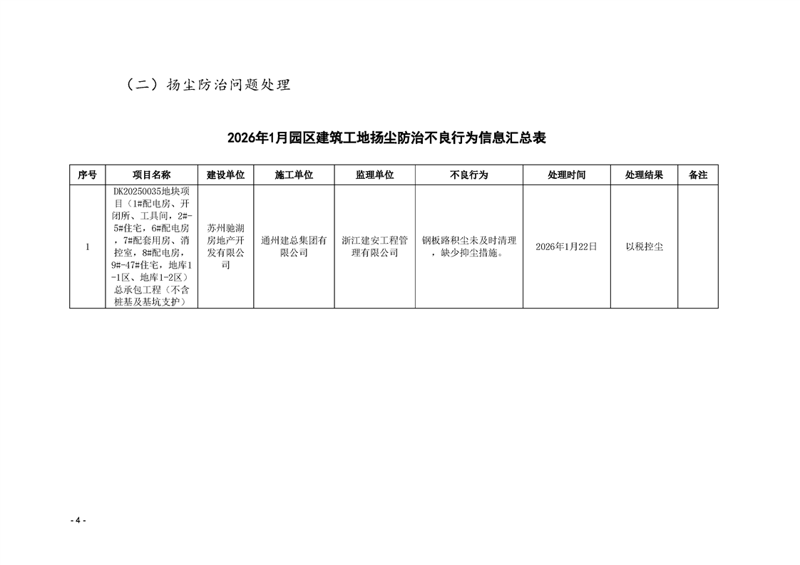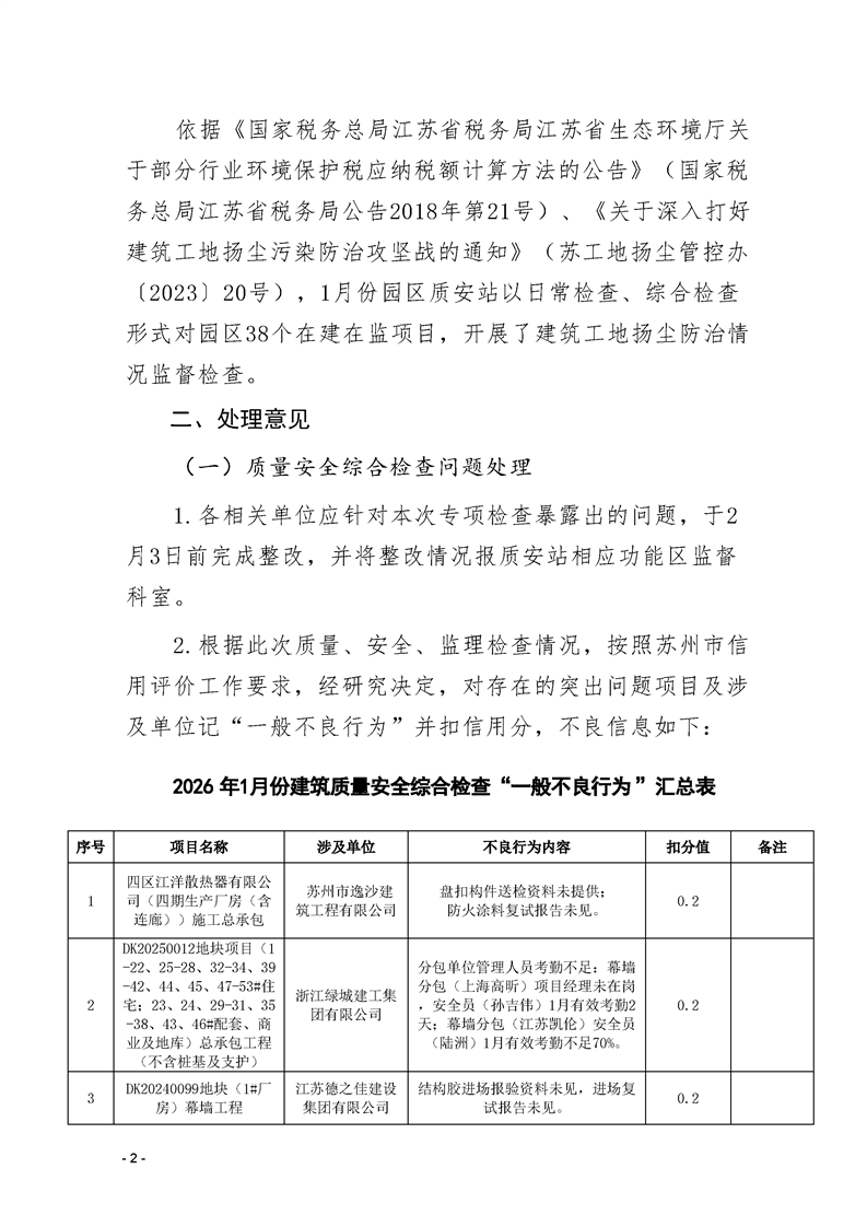 園區(qū)質(zhì)安站關(guān)于1月份建筑質(zhì)量安全綜合檢查、揚(yáng)塵防治不良信息的通報(bào)