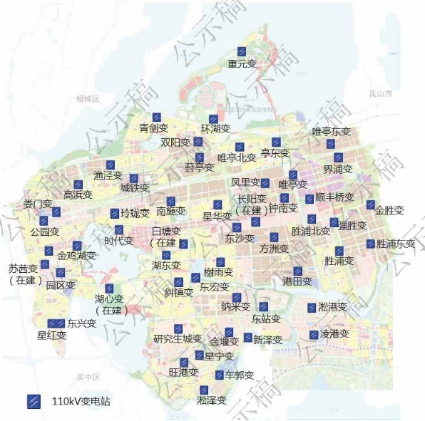 遠期園區共設置110千伏變電站52座。保留現狀110千伏變電站14座;擴建現狀110千伏變電站16座;在建110千伏變電站4座(蘇茜變、白塘變、湖心變和長陽變);規劃新建110千伏變電站22座。
