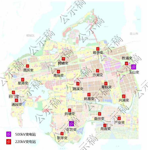 遠期園區共形成16座220千伏變電站分供電。保留現狀220千伏變電站5座,主變容量3240兆伏安;擴建現狀220千伏變電站3座,主變容量達到2160兆伏安(其中擴容720兆伏安)。考慮到負荷增長的需求,規劃新建8座220千伏變電站,分別為220千伏高浜變、通園變、唯亭變、勝浦變、興浦變、桑田變、新平變、錦溪變,共新增主變容量5760兆伏安。