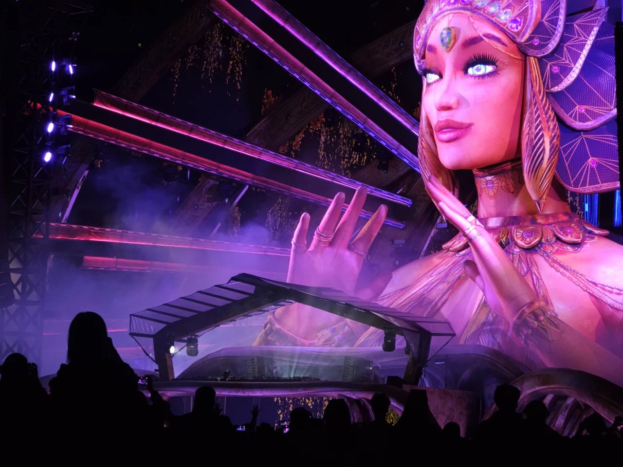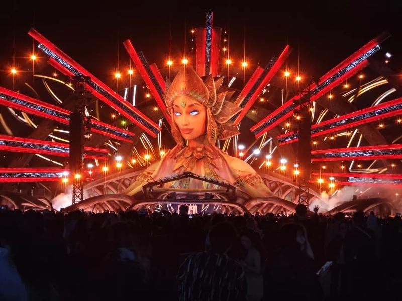 全球頂尖團隊設計的日升女神kineticFIELD主舞臺,通過精密機械實現女神雙臂隨樂律動,配合激光、火焰與同步煙花,首日便誕生百萬級傳播的“女神”名場面。circuitGROUNDS舞臺以360度巨型LED墻構建科技矩陣,stereoBLOOM舞臺以前衛工業風見證多位國際大咖中國首秀,boomboxARTCAR移動舞臺則以“巨型音箱”造型引爆隨行狂歡。