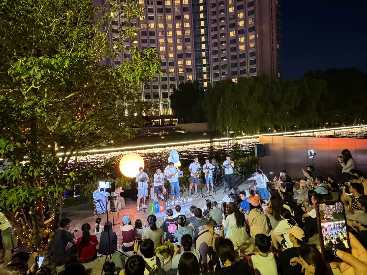 夜幕下的誠品生活蘇州格外熱鬧。由蘇州愛樂樂團帶來的「水岸點歌臺:青春OST之夜」在戶外水岸舞臺溫情上演。經典影視金曲在夏夜晚風中流淌,觀眾們或坐或立,不時跟著旋律輕聲哼唱,手機閃光燈在夜色中連成一片星海。市集角落,人們手捧咖啡輕聲交談,享受著充滿書香與創意的蘇式夏夜。