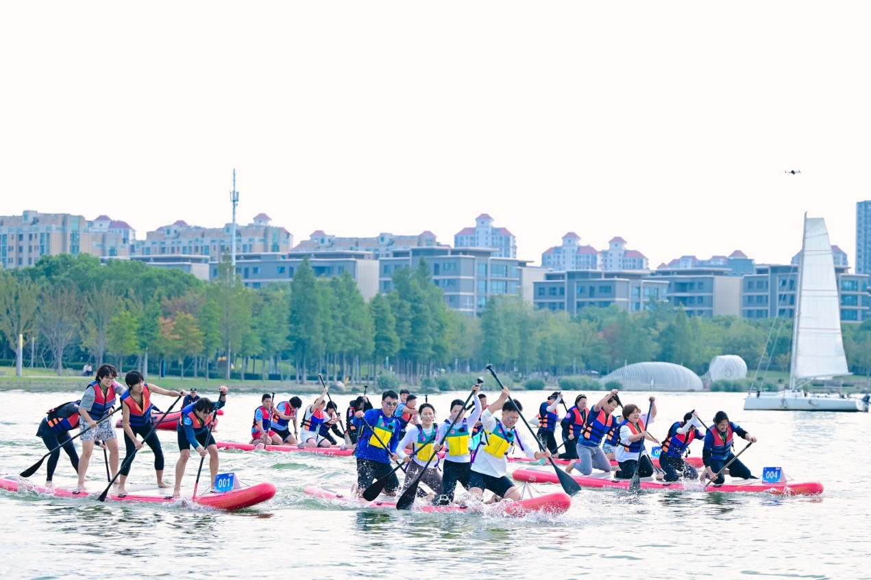 “今天天氣條件很好,湖面平靜,非常適合槳板運動。”來自西交利物浦大學代表隊的隊員表示,隊伍平時會開展平衡性訓練、直線劃行等練習,希望能在這場比賽中發揮出最好水平。值得一提的是,聚焦科教創新區特色,來自園區各科研院所的十余位領軍人才組成代表隊,從實驗室走向水域賽場,展現出科研工作者別樣的活力與風采。“雖然剛開始接觸這項運動,但槳板運動帶來的與自然融合的體驗讓人感到非常舒適,期待以賽會友,在競逐中促進交流學習。”園區科研院所領軍人才代表隊隊員程功弼說道。
