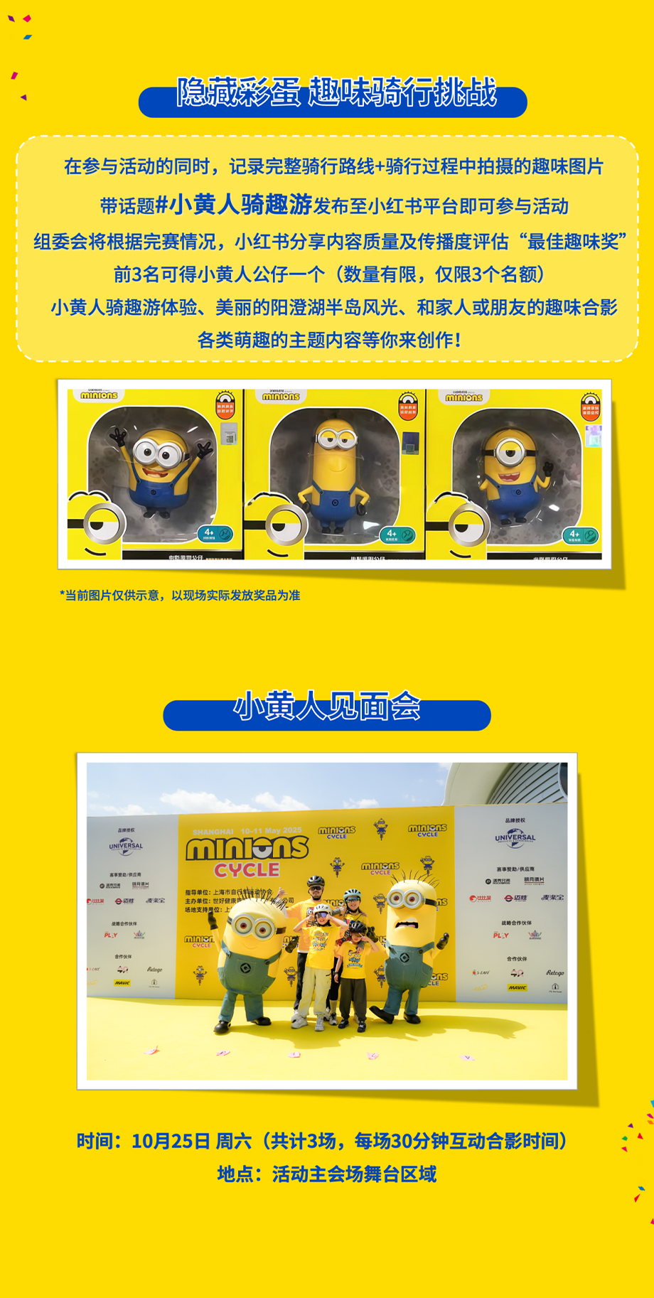 此外,在參與活動的同時,記錄完整騎行路線+騎行過程中拍攝的趣味圖片,帶話題#小黃人騎趣游發布至小紅書平臺還可參與“隱藏彩蛋趣味騎行挑戰”活動,后續活動主辦方將根據完賽情況、小紅書分享內容質量及傳播度評估“最佳趣味獎”,前3名可獲得小黃人公仔一個。