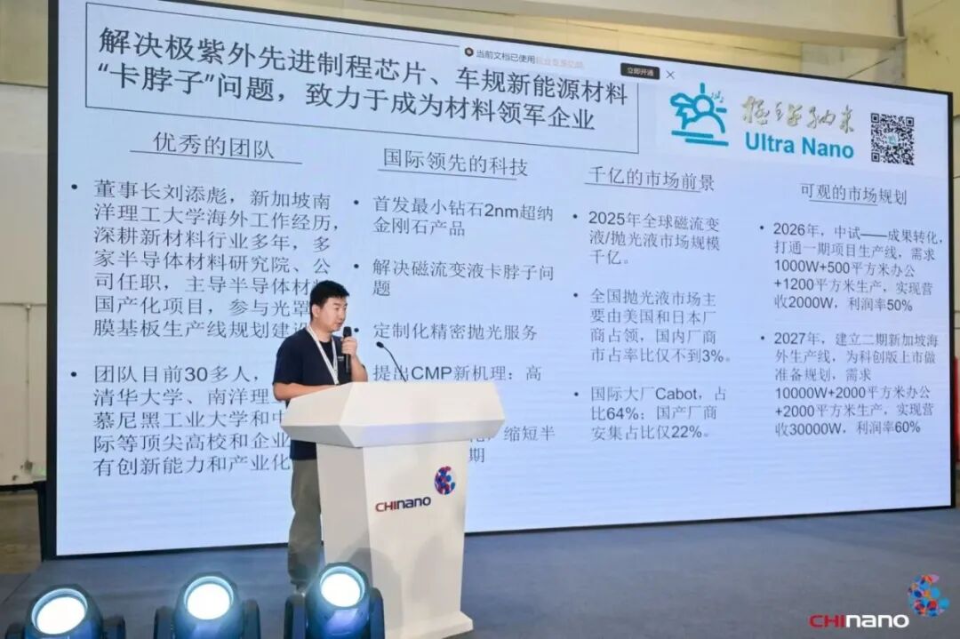 蘇州極鉆納米科技有限責任公司CEO劉添彪,介紹了《超納金剛石三代半加半導體精拋材料和算法產(chǎn)業(yè)化》。超納金剛石具有量子特性的超小尺寸效應(yīng),比普通金剛石更硬,導熱性、光、聲、電、磁、負載、生物相容性,可應(yīng)用在精密拋光、磁流變、納米機器人、核電池等領(lǐng)域。該項目聚焦于超納金剛石材料的宏量生產(chǎn),粒徑晶型表面調(diào)控,相比較傳統(tǒng)的爆轟法破碎法,其超納金剛石尺寸更小一個數(shù)量級,更凸顯量子特性。作為超納材料高新技術(shù)的先鋒,該公司以半導體產(chǎn)品與車規(guī)新能源材料雙輪驅(qū)動,構(gòu)建起以研發(fā)為主導、生產(chǎn)、銷售、進出口為一體的產(chǎn)學研結(jié)合新星企業(yè),專注于硬科技、卡脖子、國產(chǎn)替代的戰(zhàn)略布局。