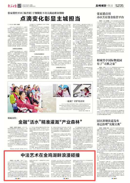 活動期間,在蘇州工業園區李公堤文化創意街區,由法國藝術家貝隆與中國書法家費之雄、蘇州大學藝術學院教授張大魯聯袂創作的裝置藝術作品《凝望》驚艷亮相:文字圖形與波紋不銹鋼相結合,呼應塞納河與金雞湖的水韻,呈現了一場跨越東西方文明的詩意凝望。