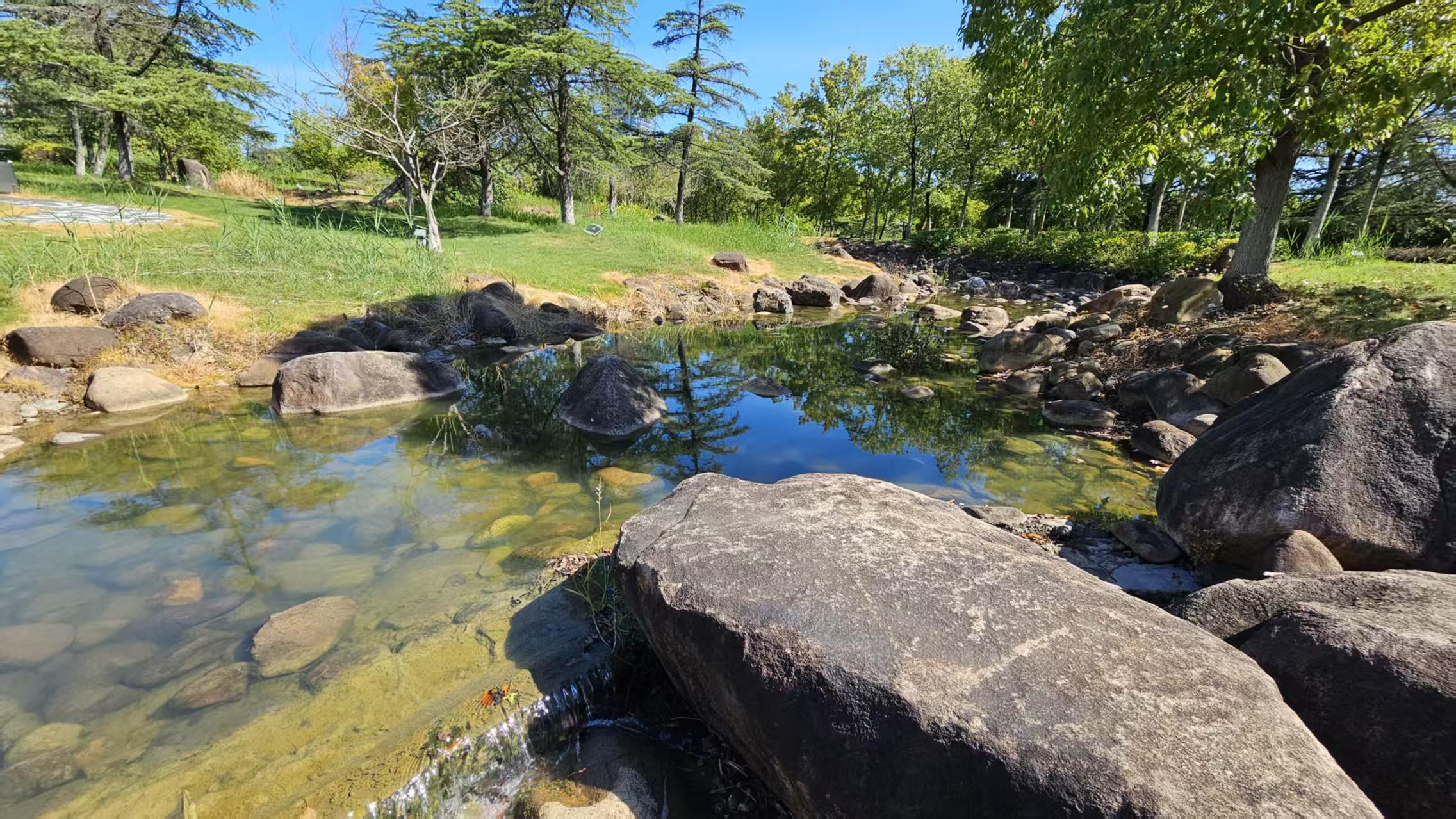 原先,該溪流景觀設(shè)計為季節(jié)性旱溪,僅在雨季形成水流,存在水量不穩(wěn)定、景觀效果欠佳等問題。市政服務(wù)集團(tuán)通過引入高效節(jié)能水泵系統(tǒng),優(yōu)化溪道走向與排水布局,實(shí)施全面清淤疏通工程,成功突破傳統(tǒng)旱溪的功能限制,構(gòu)建起四季常流水系景觀。