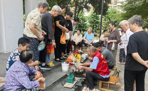 與此同時(shí),同星園廣場上熱鬧非凡,一場結(jié)合便民服務(wù)與趣味游園的創(chuàng)意活動(dòng)在此開展。便民服務(wù)區(qū)內(nèi)匯聚了健康咨詢、理發(fā)修甲、磨刀、智能AI宣傳、套圈等多元化項(xiàng)目,網(wǎng)格員和志愿者引導(dǎo)居民有序參與,并耐心為老人測量血壓,提供個(gè)性化健康指導(dǎo)。游園活動(dòng)區(qū)內(nèi)人頭攢動(dòng),投壺競技、果蔬套圈、“好運(yùn)滾滾來”等游戲項(xiàng)目前吸引了不少老年居民圍觀參與。“紅管”志愿者用通俗易懂的語言講解游戲規(guī)則,協(xié)助老人游玩,現(xiàn)場笑聲不斷,讓老年居民在輕松愉悅的氛圍中感受社區(qū)的貼心關(guān)懷。
