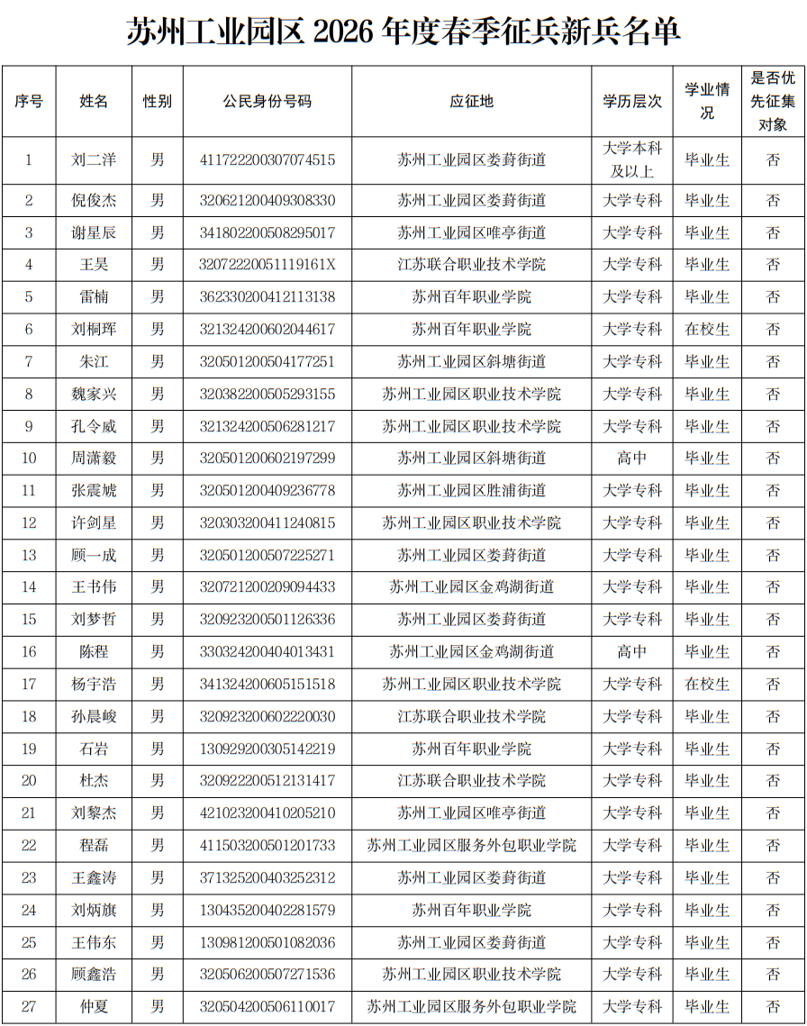 2026年蘇州工業園區春季征兵新兵名單公示(41人)
