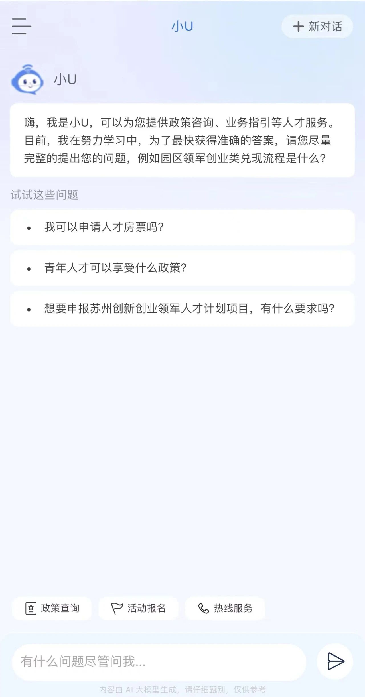 自2025年上線以來,“小U”已累計(jì)提供對(duì)話服務(wù)6107次,平臺(tái)瀏覽量達(dá)8.2萬次,服務(wù)訪客超2萬人,構(gòu)建起“政策秒配、服務(wù)無界”的智能化人才服務(wù)體系。