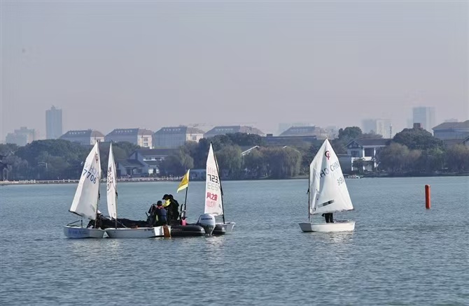 昨天,蘇州工業園區金雞湖上帆影點點,帆船愛好者在湖面上揚起風帆、乘風追浪,享受活力滿滿的周末時光。