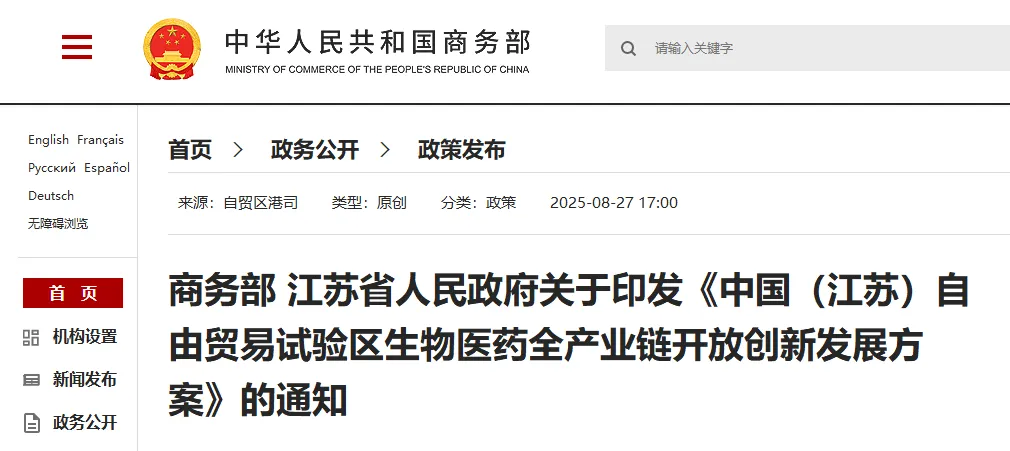 2025年8月,經(jīng)國務院同意,商務部和江蘇省人民政府聯(lián)合印發(fā)江蘇自貿(mào)區(qū)生物醫(yī)藥全產(chǎn)業(yè)鏈創(chuàng)新發(fā)展方案。江蘇成為全國第一個獲批生物醫(yī)藥領域試點的省份。針對方案,江蘇省人民政府也印發(fā)了專項實施方案,包含77項政策舉措。目前,蘇州自貿(mào)片區(qū)已推進31項政策落地見效。