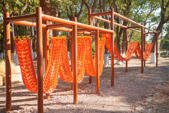 Another highlight, created by a Canadian artist, translates ancient symbols from local relics into striking orange swings that seem to breathe life into history as they sway.