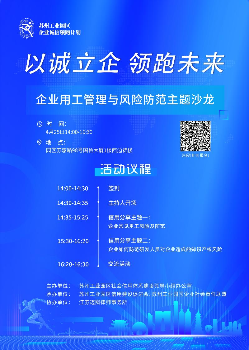 企業勞動用工常見的風險有哪些?如何預防這些風險的發生?員工職場誠信如何建設?針對上述問題,園區“企業誠信領跑計劃”定于4月25日舉辦系列活動之企業用工管理與風險防范主題沙龍,邀請律所專家開展分享交流活動,共探新形勢下用工風險防控和合規管理新思路。