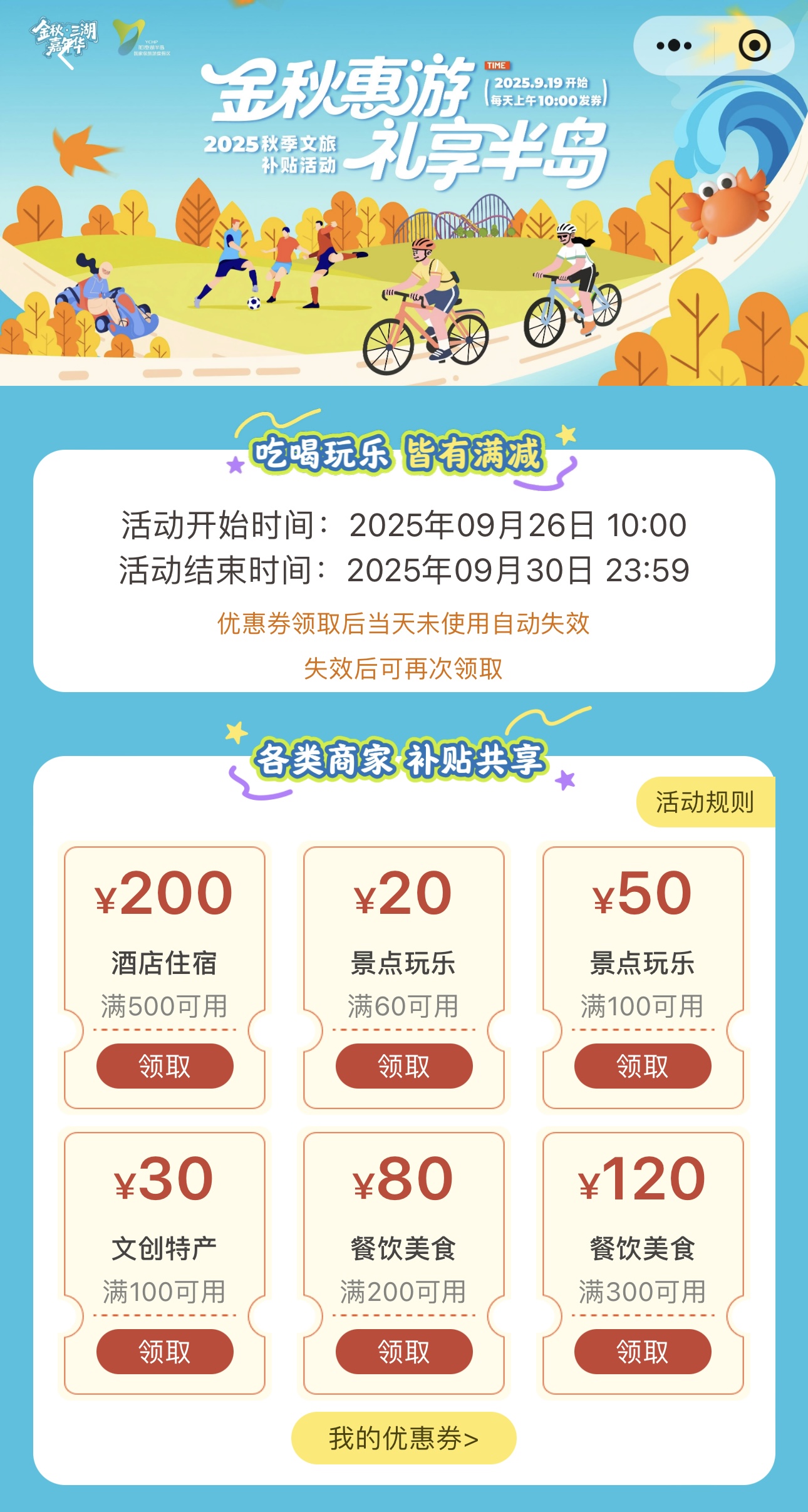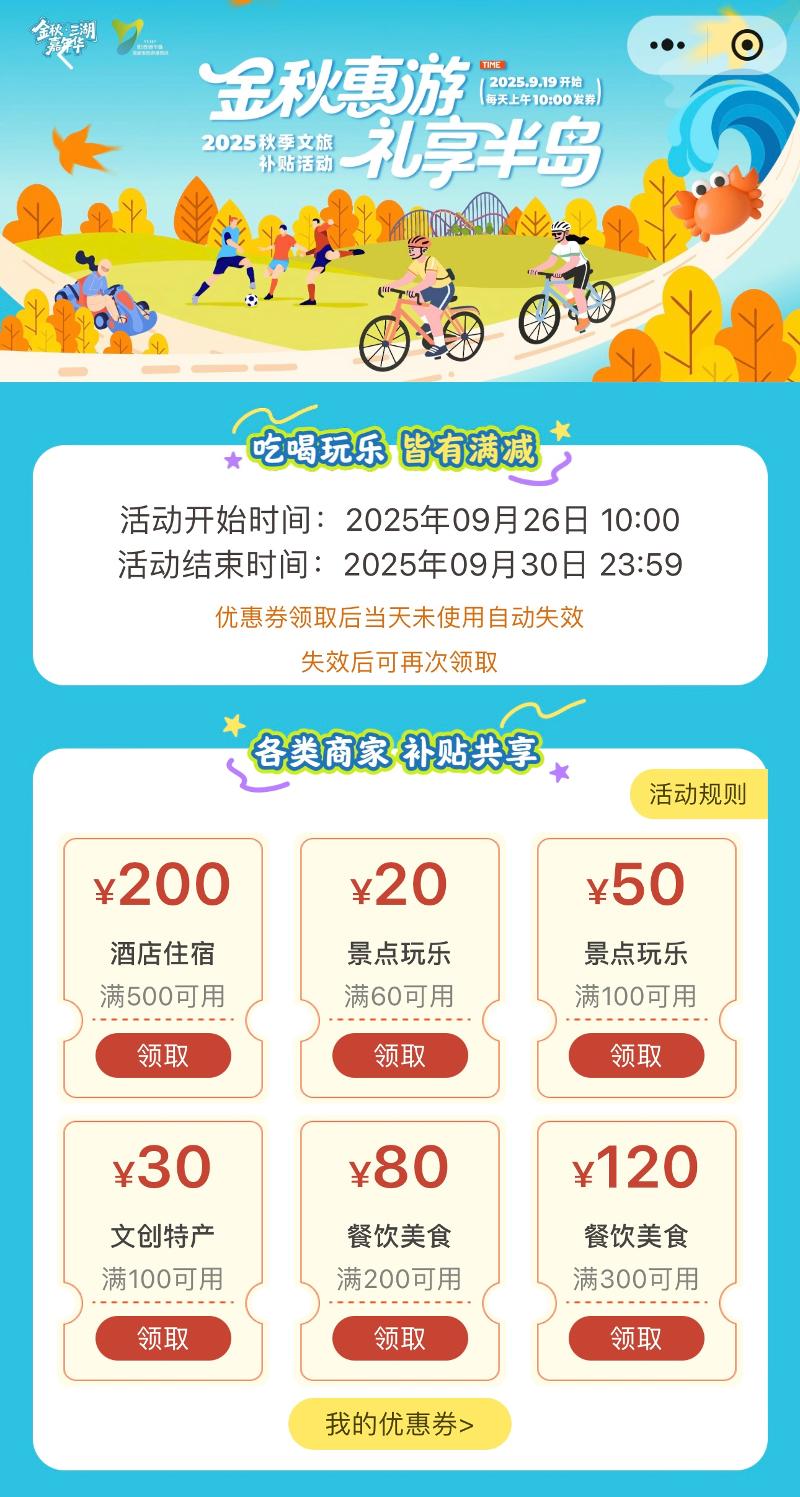 即日起至9月30日,每日10:00起,“惠游園區(qū)”小程序?qū)⑾蘖堪l(fā)放文旅消費券,覆蓋餐飲、住宿、文創(chuàng)、娛樂等多個場景。市民游客只需注冊登錄小程序,進入文旅消費活動專題頁面,即有機會領(lǐng)取不同面額的優(yōu)惠券,數(shù)量有限、先到先得。