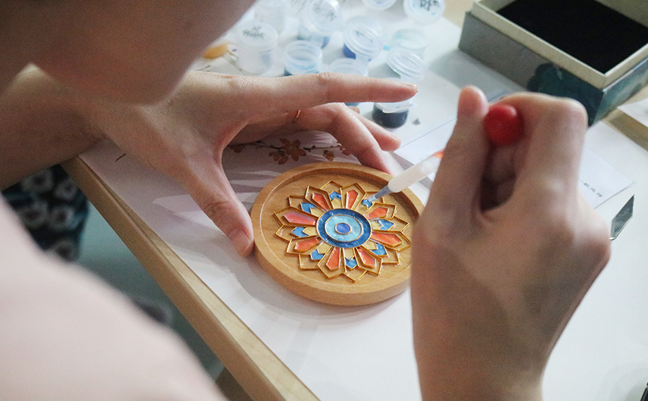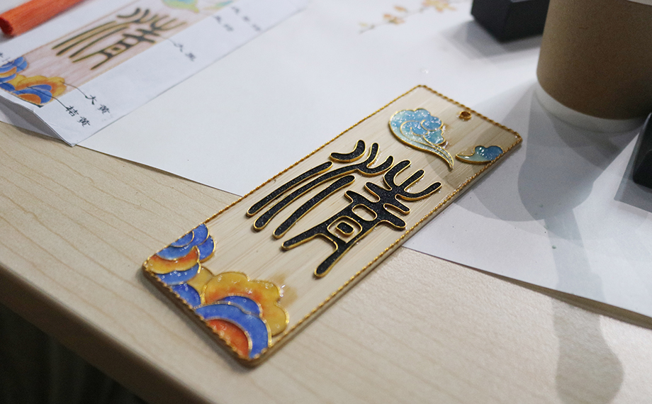 正是因?yàn)橐詼鬄榇淼牧汲純A力為民,社會(huì)才能進(jìn)步、時(shí)局才能穩(wěn)固,這也為乾隆時(shí)期景泰藍(lán)的復(fù)興創(chuàng)造了條件。景泰藍(lán),即掐絲琺瑯工藝,是中國(guó)的著名特種金屬工藝品類(lèi)之一。在隨后的文化體驗(yàn)課環(huán)節(jié),大家興致勃勃地在老師的講解和幫助下參與到景泰藍(lán)手工技藝的體驗(yàn)活動(dòng)中,以金絲作胎,填充色釉,制作出屬于自己的景泰藍(lán)工藝蓮花杯墊、書(shū)簽、小鏡,用蓮心現(xiàn)廉韻,感受傳統(tǒng)文化魅力。